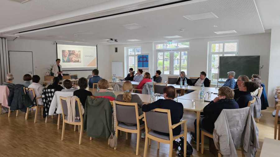 Im Bild links zu sehen ist eine Fortbildungsveranstaltung in den Räumlichkeiten der Diakoniestation mit der bekannten Demenzberaterin Karin Platje im Oktober 2024. Karin Platje steht neuerdings für Mitarbeiterinnen und Patient/innen der Diakoniestation Neuenhaus beratend und unterstützend zur Verfügung. Falls Sie gerne eine Beratung hätten, können Sie sich an die Diakoniestation wenden.